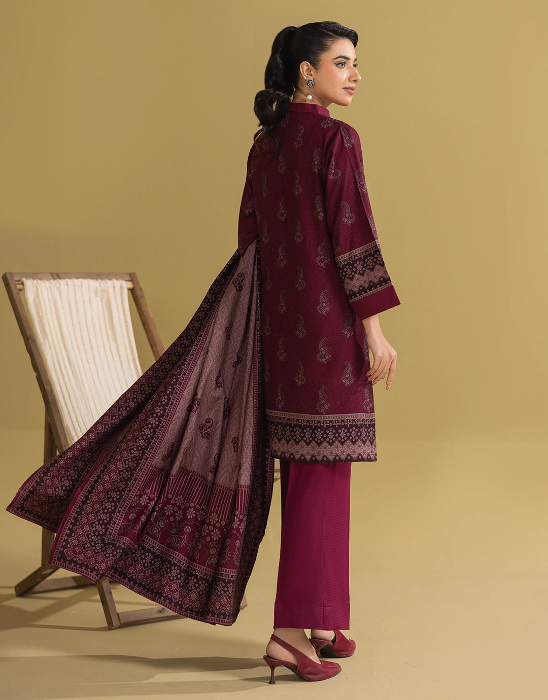 Description A deep burgundy dhanak suit with elegant digital detailing. The color’s intensity gives the outfit a luxurious winter feel. Paired with matching trousers and a beautifully printed dupatta.