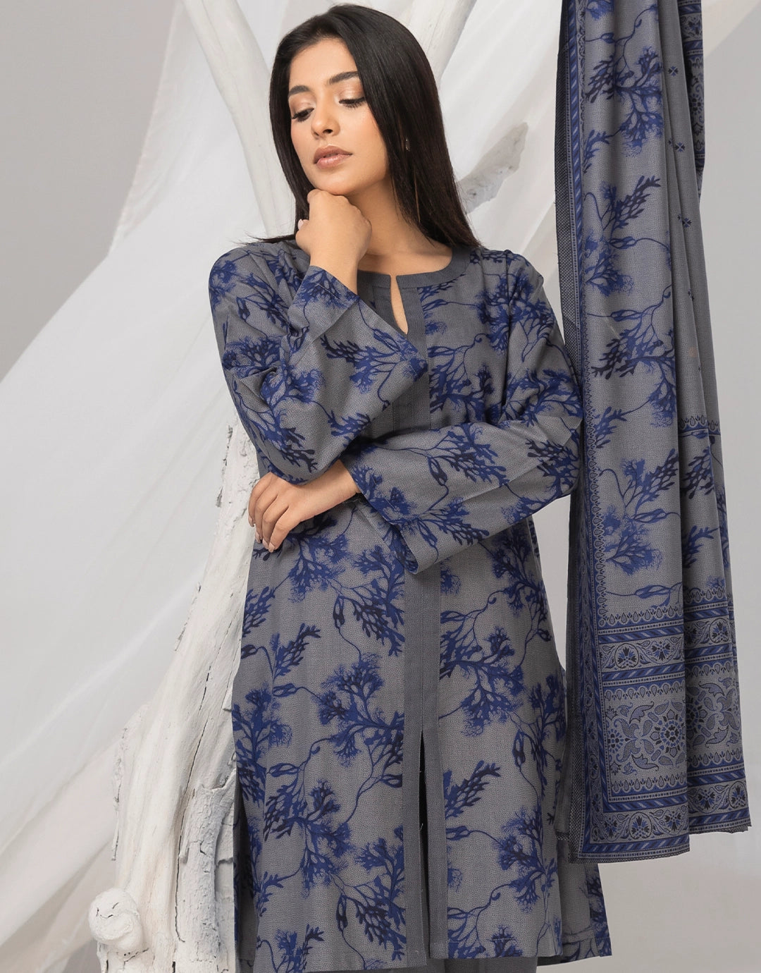 Description A cool steel-blue dhanak 3-piece showcasing graceful digital motifs. The long drape of the dupatta enhances the sophisticated tone. Perfect for a chic, soft winter statement.