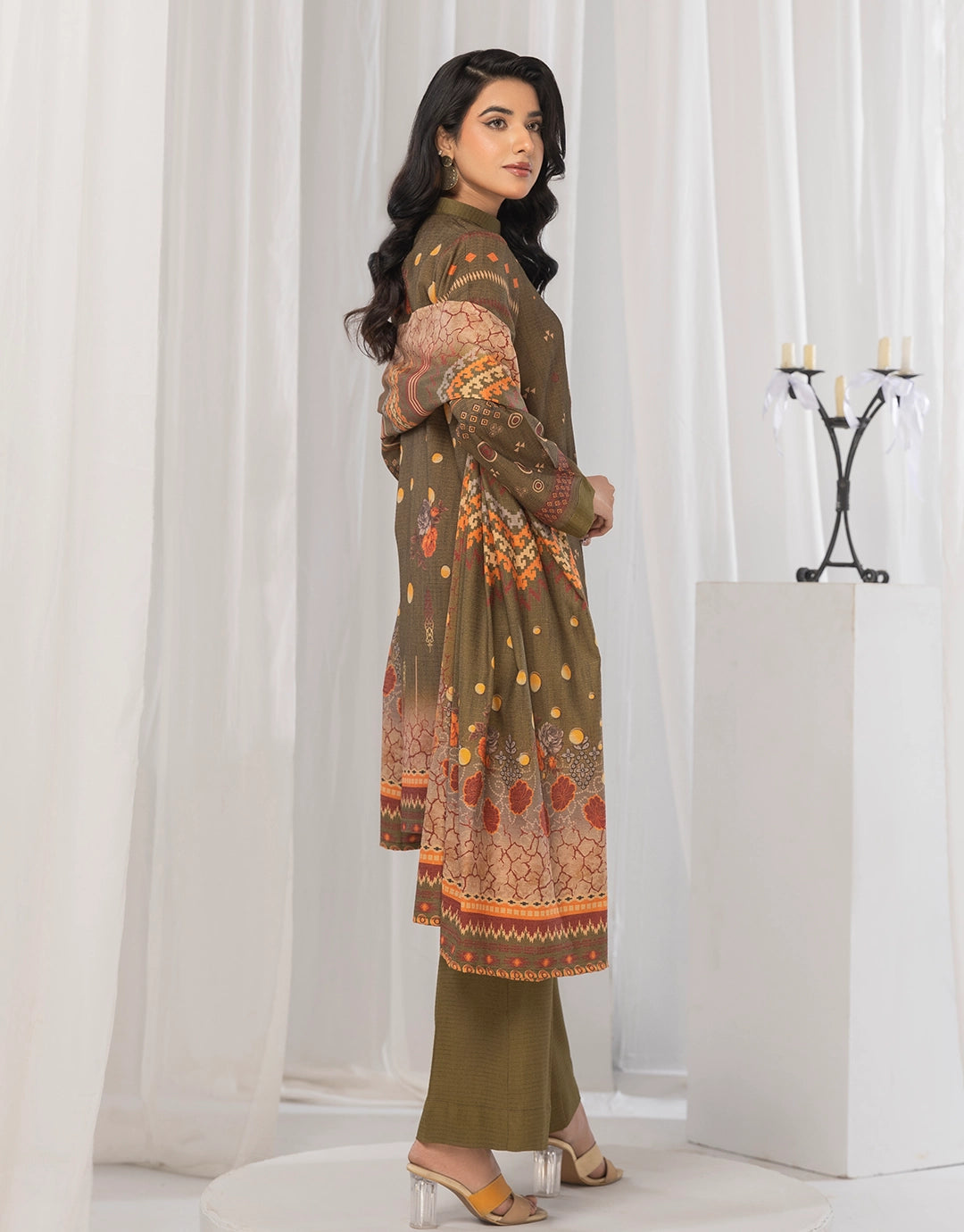 Description A soft olive-brown dhanak 3-piece with subtle digital design elements. The muted tone creates a naturally graceful appearance. Paired with matching trousers and a light printed dupatta.