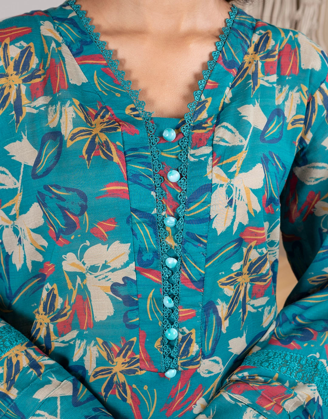 Descripton Elevate your summer look with this stunning teal blue lawn suit, crafted from premium fabric for comfort and breathability. Paired with a vibrant voile dupatta, it adds a fresh pop of color to your wardrobe.