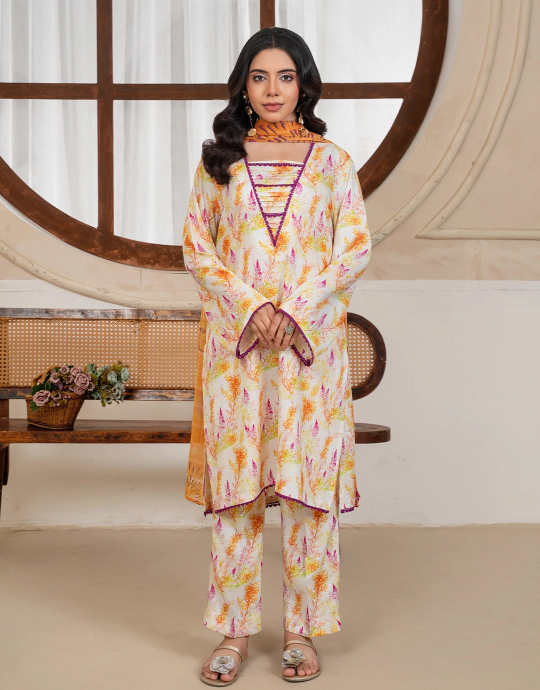 Description A vibrant linen suit featuring an abstract print in shades of orange, yellow, and fuchsia on a white base. The kurta has a V-neckline accented with purple detailing, and it comes with matching printed trousers and a narrow stole in similar warm tones.